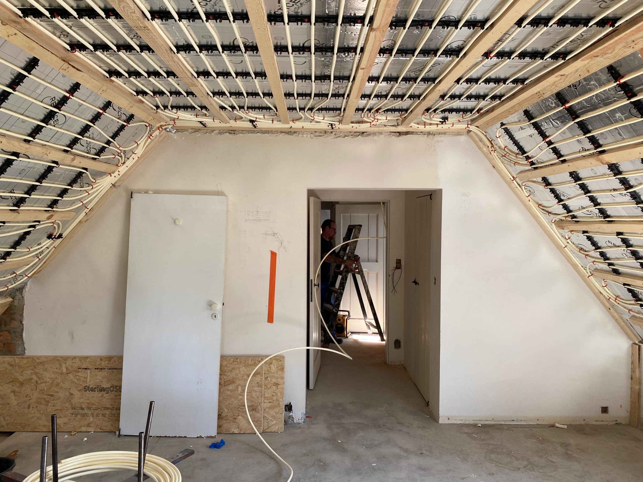 Tegen het plafond worden eerst isolatieplaten geplaatst, zodat het warmteverlies naar boven verwaarloosbaar wordt. Vervolgens worden bevestigingslatten voor de verwarmingsbuis tegen de isolatie gemonteerd. Nadien worden de buizen en de verdeelcollectoren geplaatst, waarna er afgewerkt kan worden.